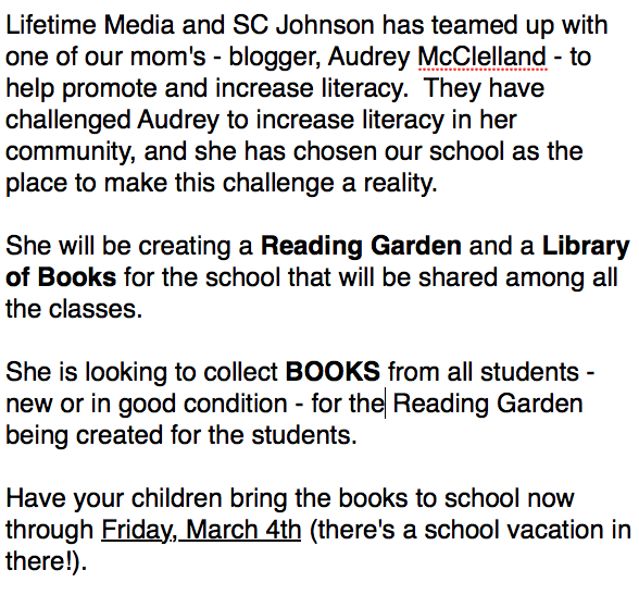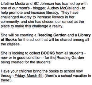 It’s so exciting to see the books waiting for me at the school, and I have had such a great response from the community… as I reached out to some local mom groups and some of my friends in looking to get some books for the Reading Garden.