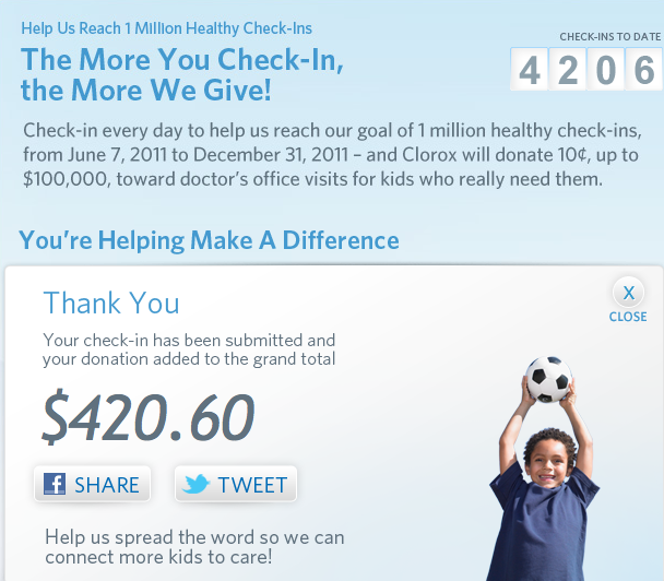 For each check-in that you do, Clorox will donate 10 cents, up to $100,000, to CHF to help support their goal of providing half a million health care visits to children in need across the country. What’s amazing is that now when you check-in with your healthy habit, you are not only helping yourself, but also the lives of others. The more you check-in, the more you give back to disadvantaged children across the country. This issue is of the utmost importance since one in five children in the U.S. live in poverty and millions of children don’t have access to regular check-ups and timely health care visits when sick.