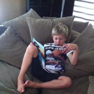 That’s Henry, the youngest McClelland brother, already wearing his shark swim cap, his brothers’ cast-off swim team suit… practicing for when HE’s on the swim team with his 3 older brothers.