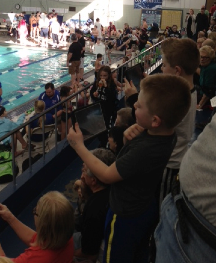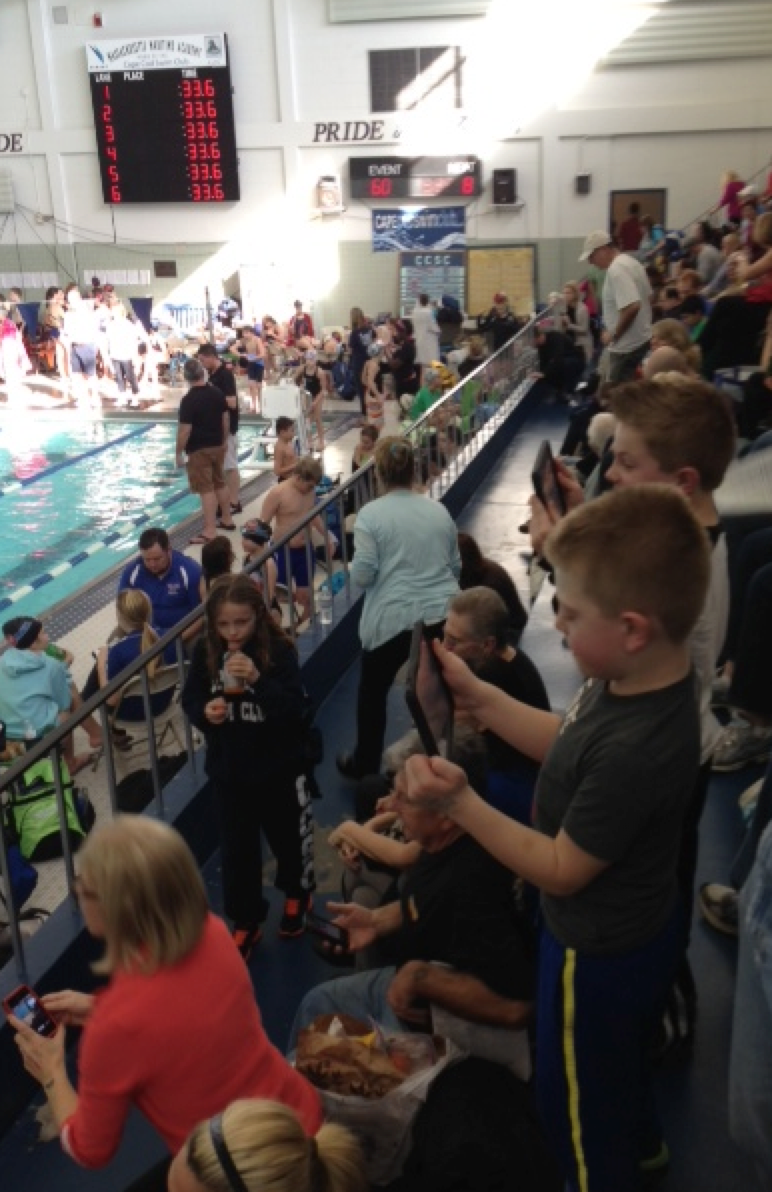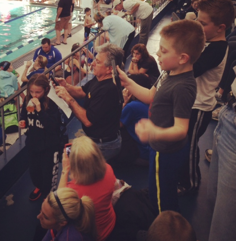 After William swam his 4th race this morning, I had a fellow swim team mom come over and say to me, “You’ve got to see what happens when William swims. All of his brothers stand-up and video and time him! I had to snap some photos for you!”