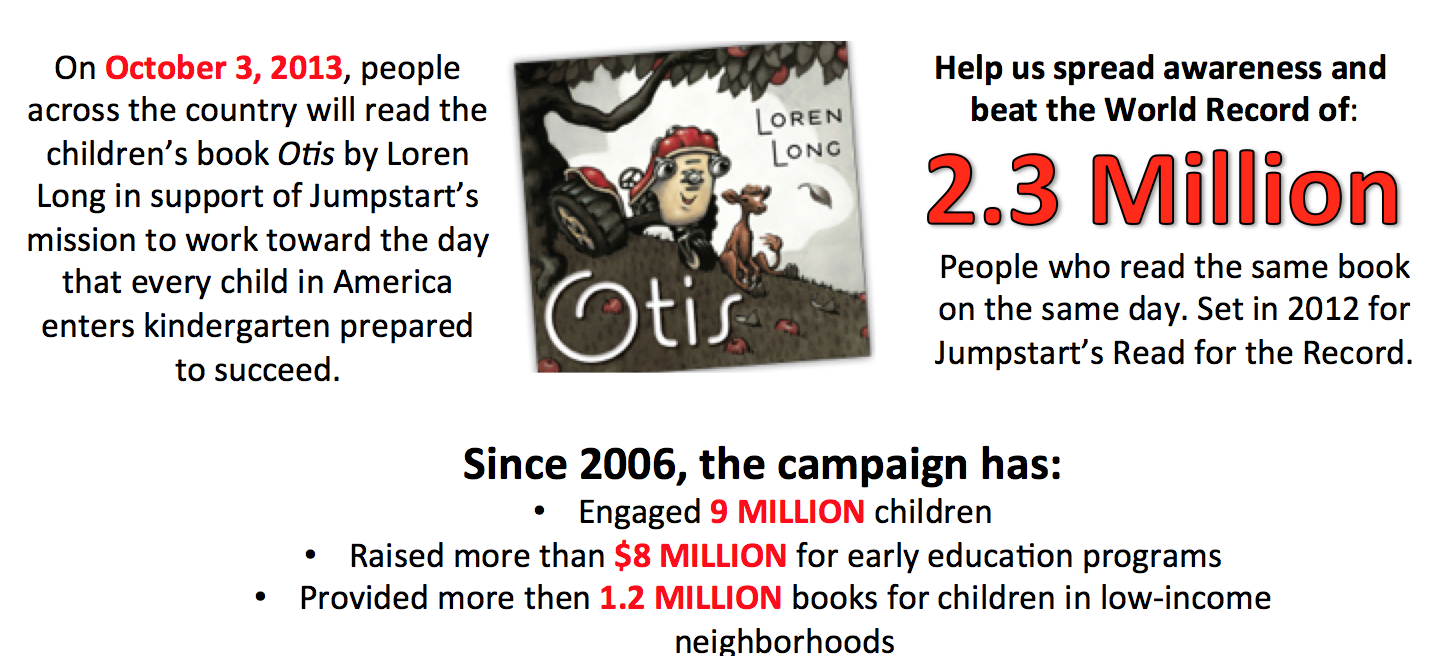 I’m excited to share that Jumpstart is hosting their 8th Read for the Record Event on October 3rd, 2013.