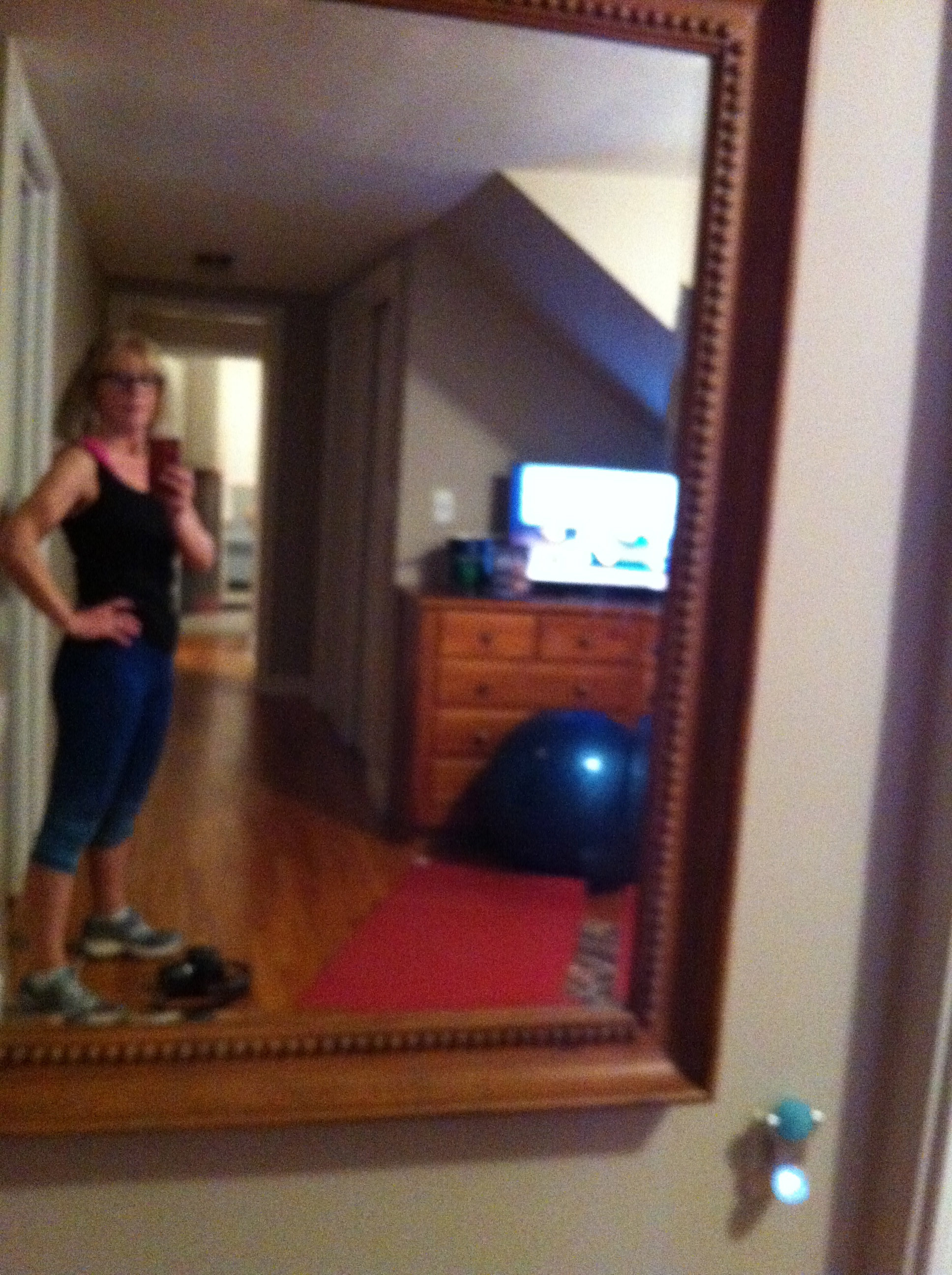 This is a shaky selfie of me after I finished my first Flip Flop Abs “The Stinger” workout with Fitz in the little exercise space I’m carving into my home, into my day, into my training, into my very core for a powerful new me…